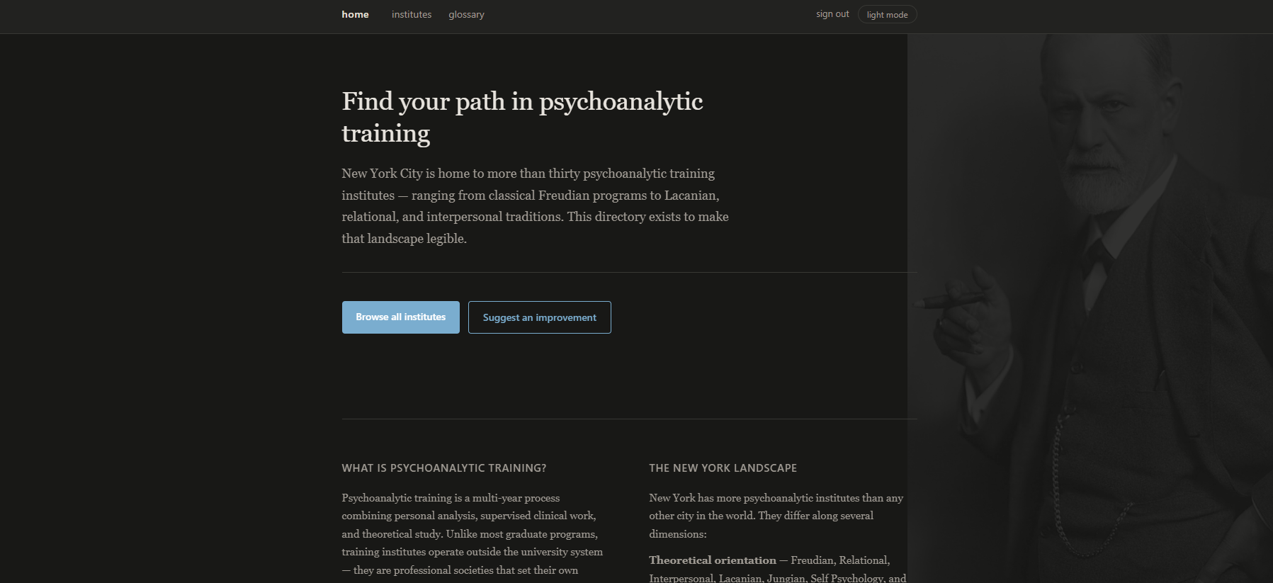 I've written before about my quixotic fantasies about building a wiki directory of analytic training institutes in New York. Well? Thanks to Claude Code (and a bit of obsessionality, and mania, and spare time), there's now a semi-functional web site. Take a look. Suggest changes. Add content!